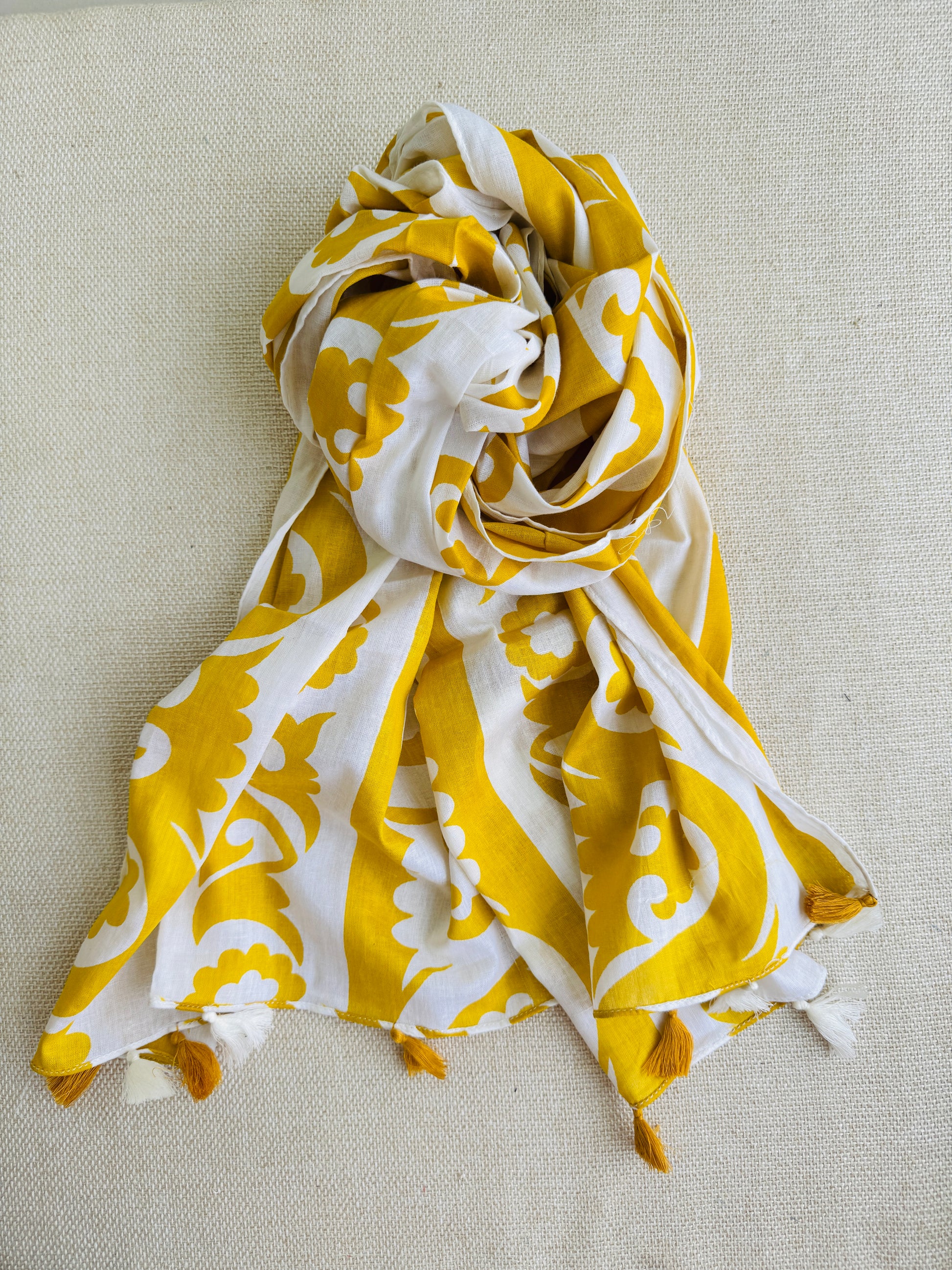 Bright poly cotton scarf - Lightweight long stole - tasseled yellow and white stole