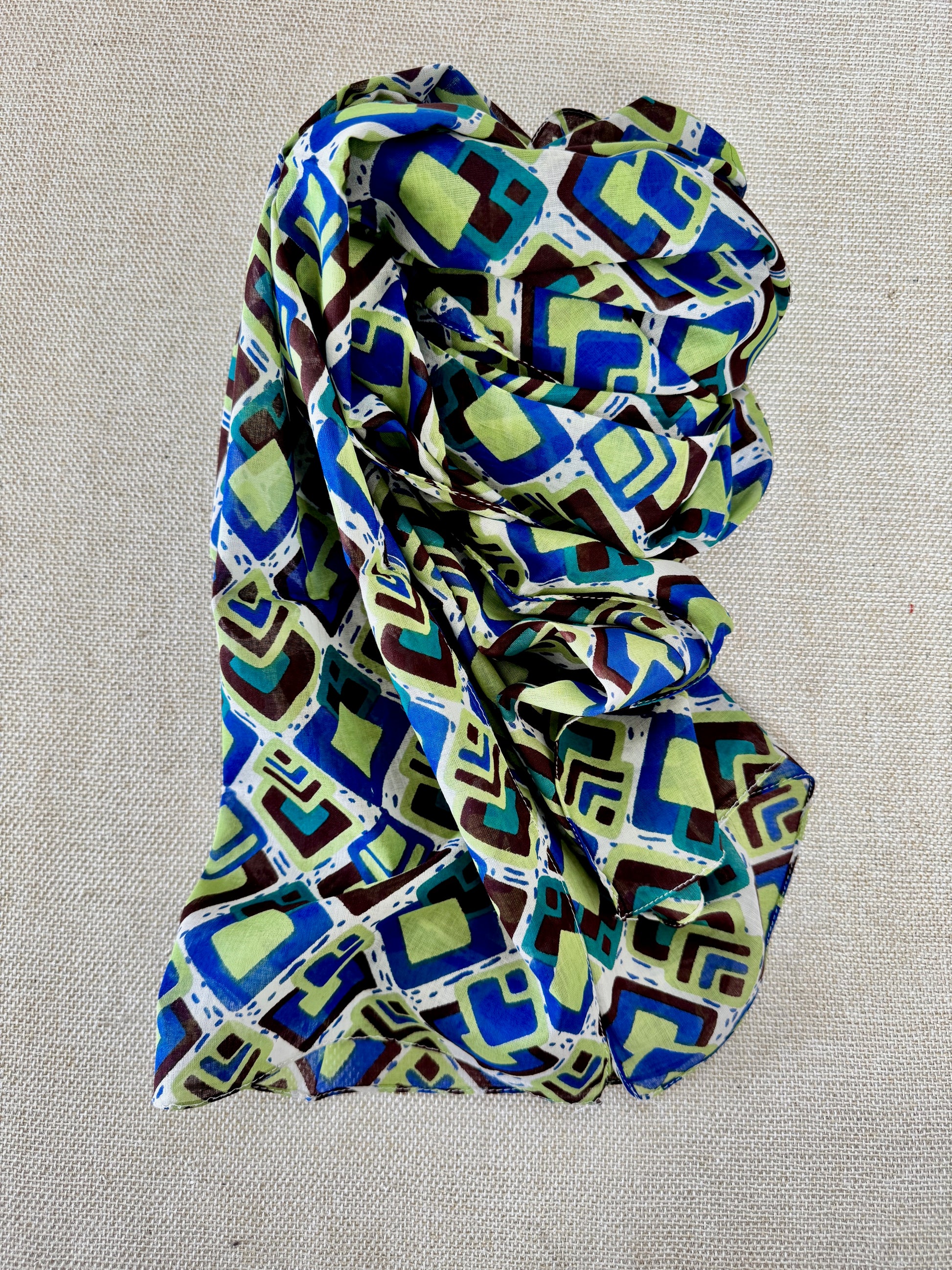 Lightweight Printed Poly-Cotton Scarf for Women - Blue Green Geometric